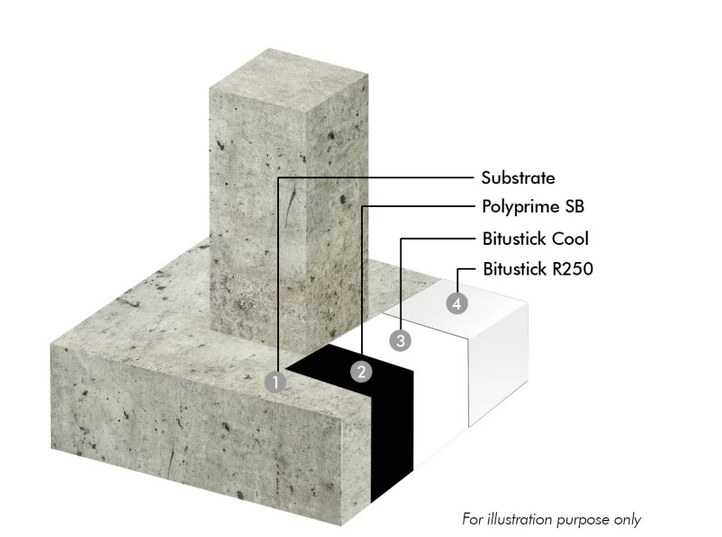 Apply Polyprime SB* (Solvent based primer) @4-6 m²/L to a clean, smooth and dry surface by brush, roller or spray. Allow the primer to dry prior to the application of the membrane. The primer promotes the adhesion between the membrane and the concrete surface.